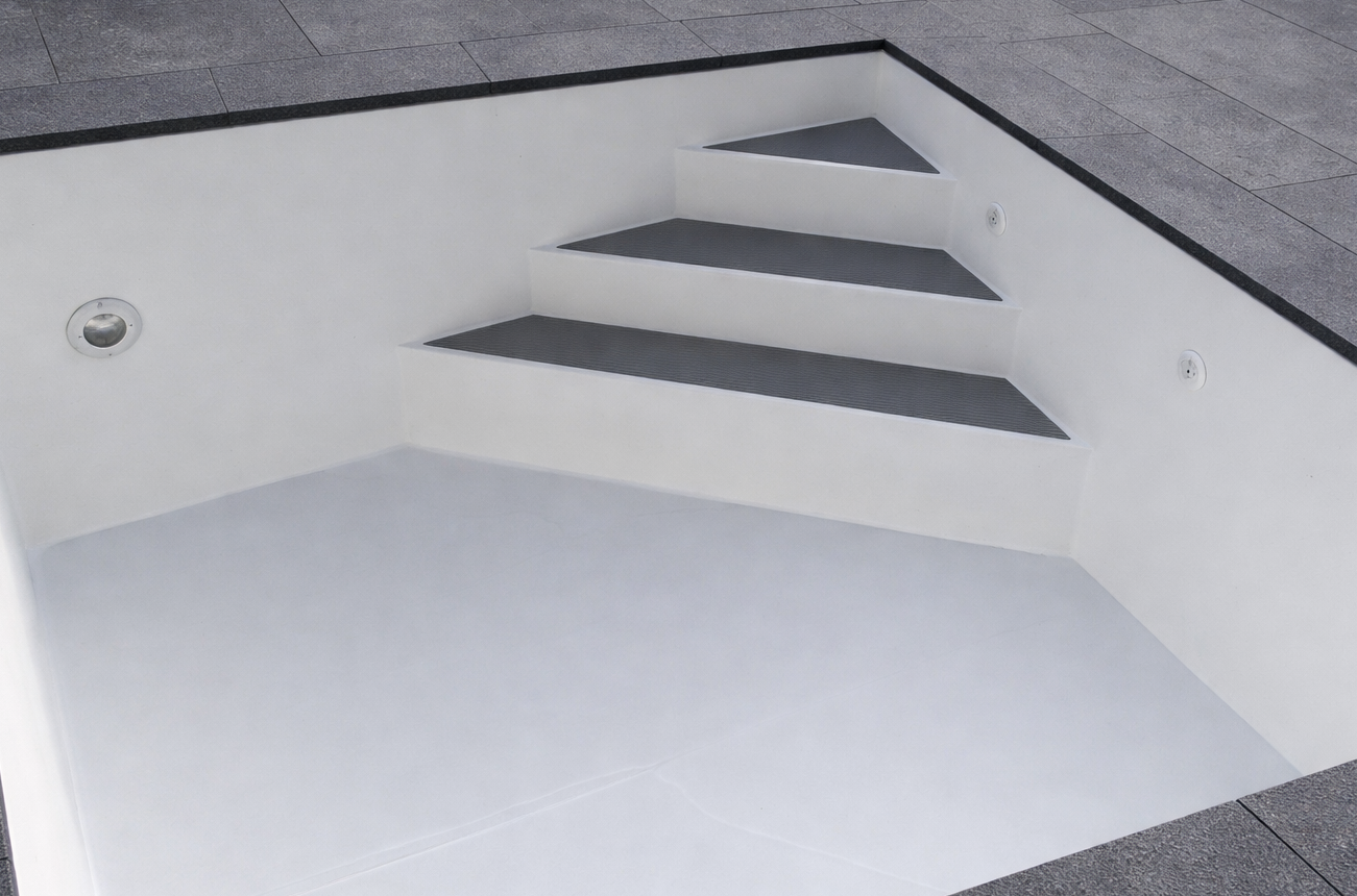 Dem Kunden stehen neben der VOR ORT verlegten 1,5 mm starken gewebeverstärkten Innenfolie noch verschiedene Eckeinstiege zur Auswahl. Diese Eckeinstiege können mit einem Sitzbankadapter zusätzlich