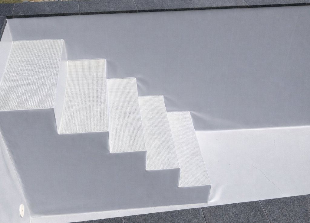 ausgestattet werden. Die speziell gefertigten Eckeinstiege mit Sitzbankadapter werden VOR ORT mit der 1,5 mm starken gewebeverstärkten Innenfolie verlegt.