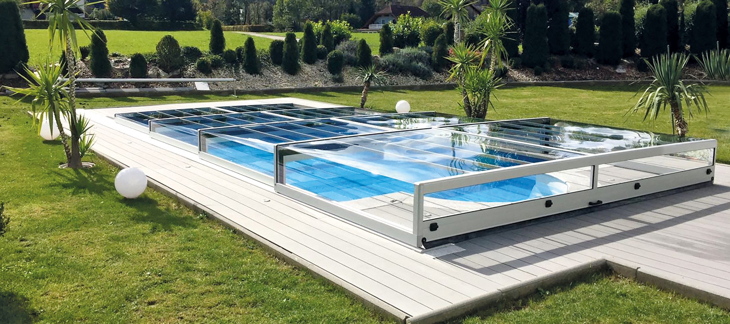 Eine Poolüberdachung bietet in erster Linie Schutz vor Verschmutzungen jeglicher Art, da es zu keinen Verunreinigungen im Poolwasser kommt. Noch dazu spart man Geld, da der Verbrauch an Poolchemie wesentlich verringert wird. Durch den Kauf einer Poolüberdachung erlangen Sie eine vollständige Isolierung des Innenraums, sodass die Wassertemperatur länger erhalten bleibt und Sie somit Ihre Schwimmsaison früher beginnen und natürlich auch verlängern können.