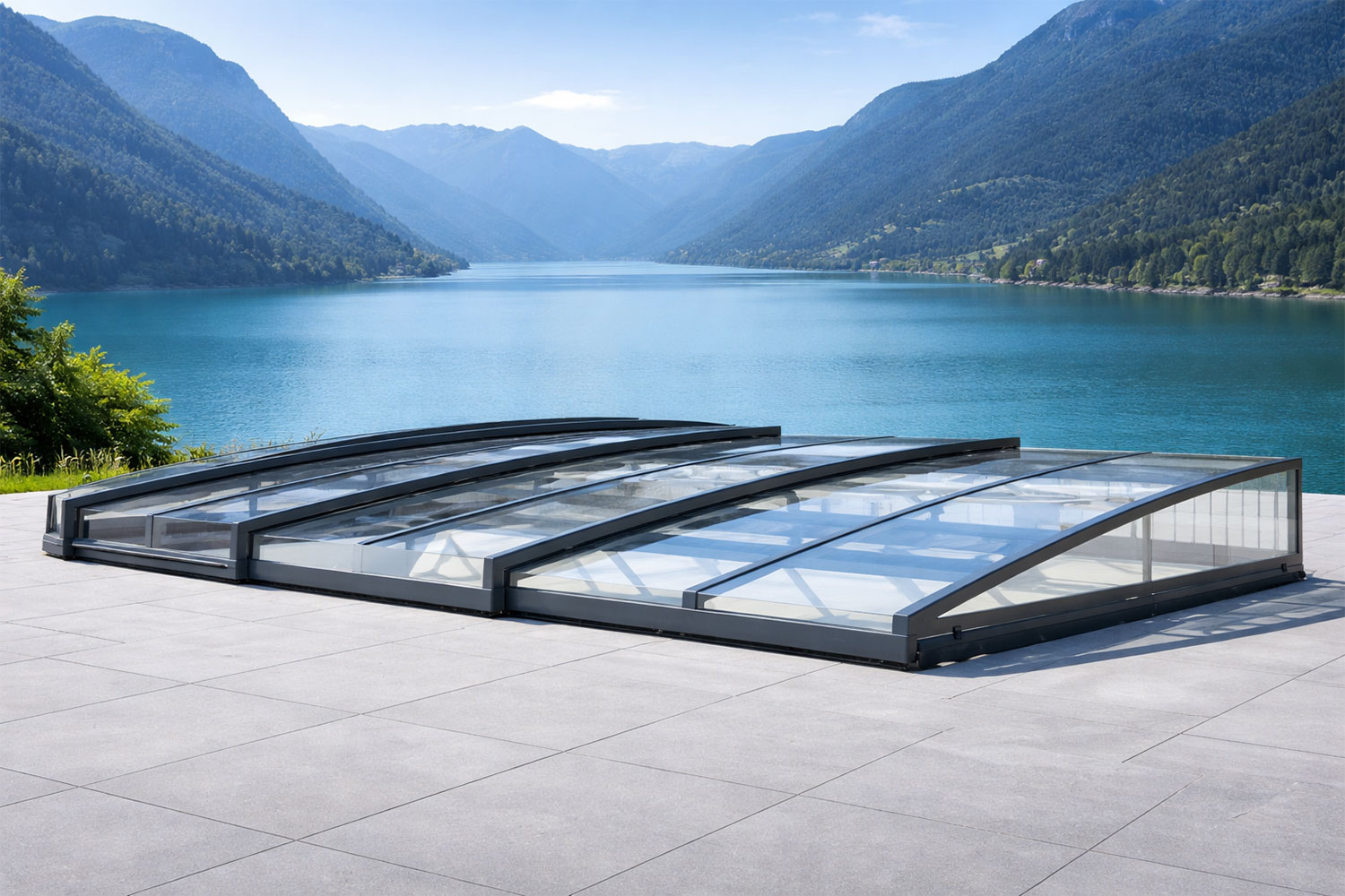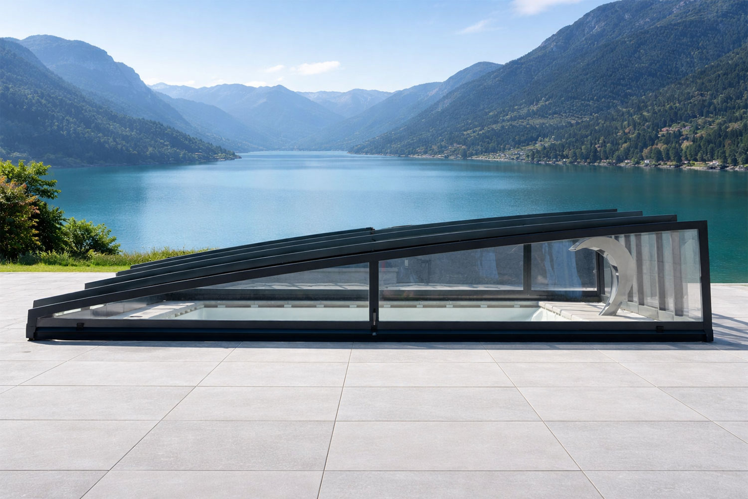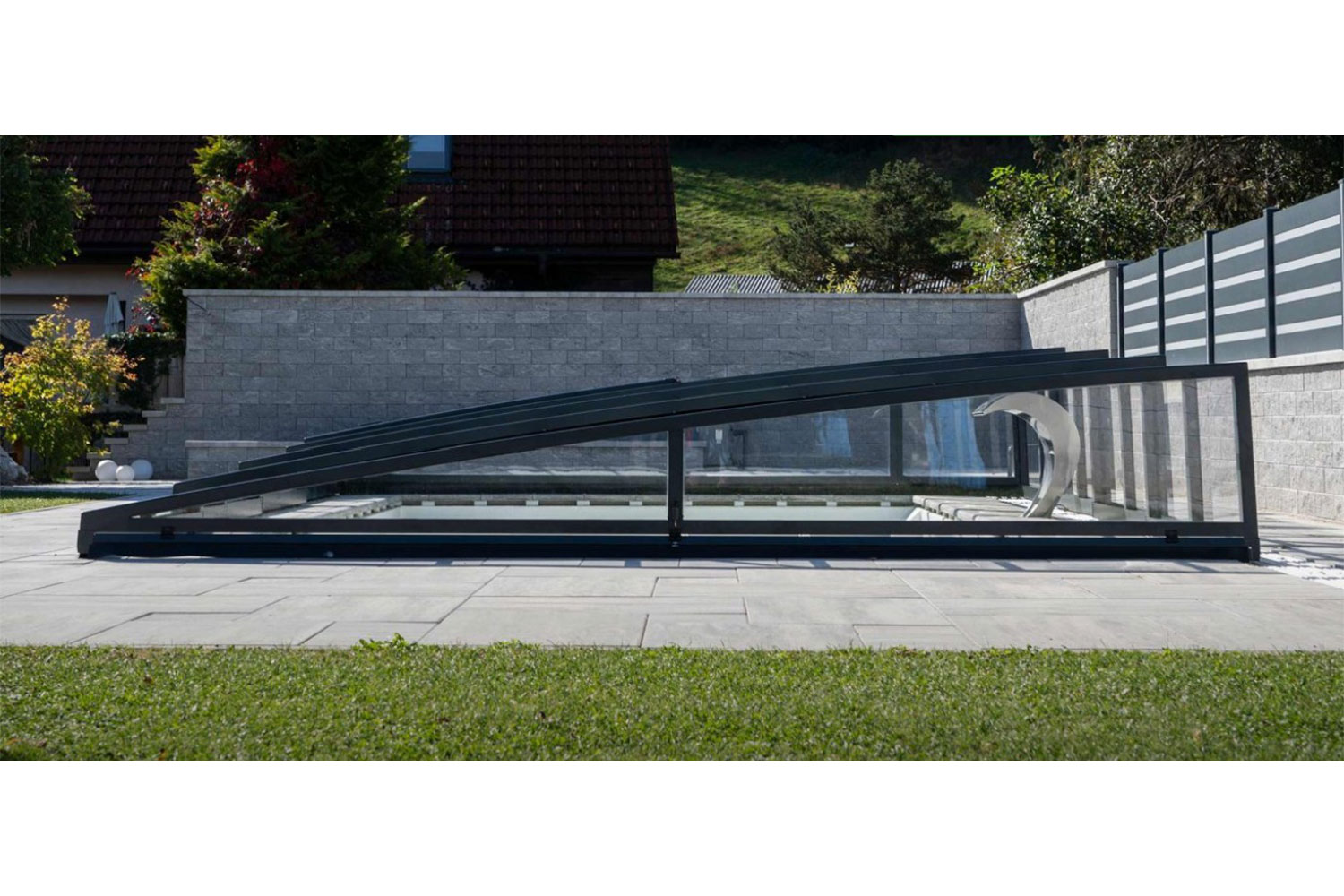 Die Poolüberdachung Avantgarde verleiht Ihrem Pool eine einzigartige Optik und kann mit einem Seiteneinstieg auch in geschlossenem Zustand genutzt werden.