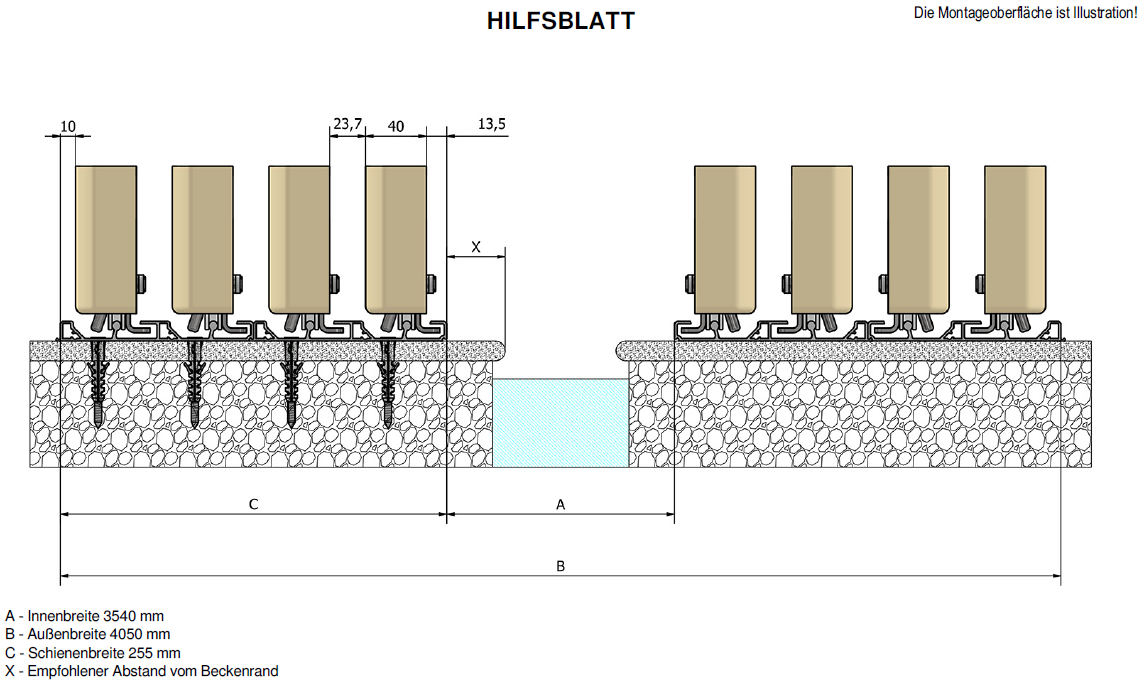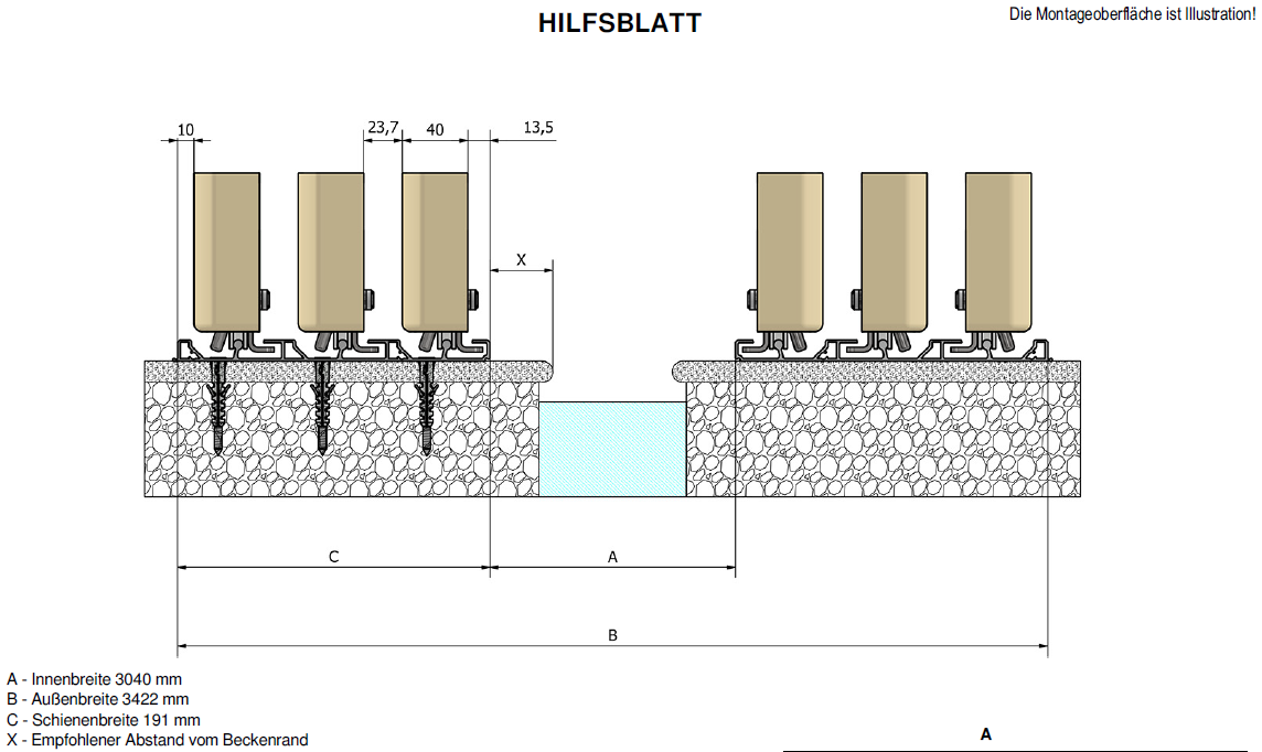 Im Bereich der Laufschienen ist bauseits ein waagrechter und fester Untergrund herzustellen (z.B. Waschbetonplatten auf Magerbeton). Bei Montage der Laufschiene auf der Granitumrandung, muss die darunterliegende Granitplatte vollflächig im Mörtlbett (Flexkleber) aufliegen, siehe Abbildung unten. Eine Verdübelung auf FEINSTEINZEUG ist mit Mehrkosten verbunden und muss auf der Checkliste angegeben werden. Zusätzlicher Montageaufwand wird seperat verrechnet. Bei der Anlieferung müssen mind. 2 Personen Bauseits bei der Entladung beigestellt werden. Für Beschädigungen an der Umrandung oder am Unterbau wird KEINE Haftung übernommen. Die Lieferung und Montage beinhaltet die einmalige An- und Abfahrt der Monteure.