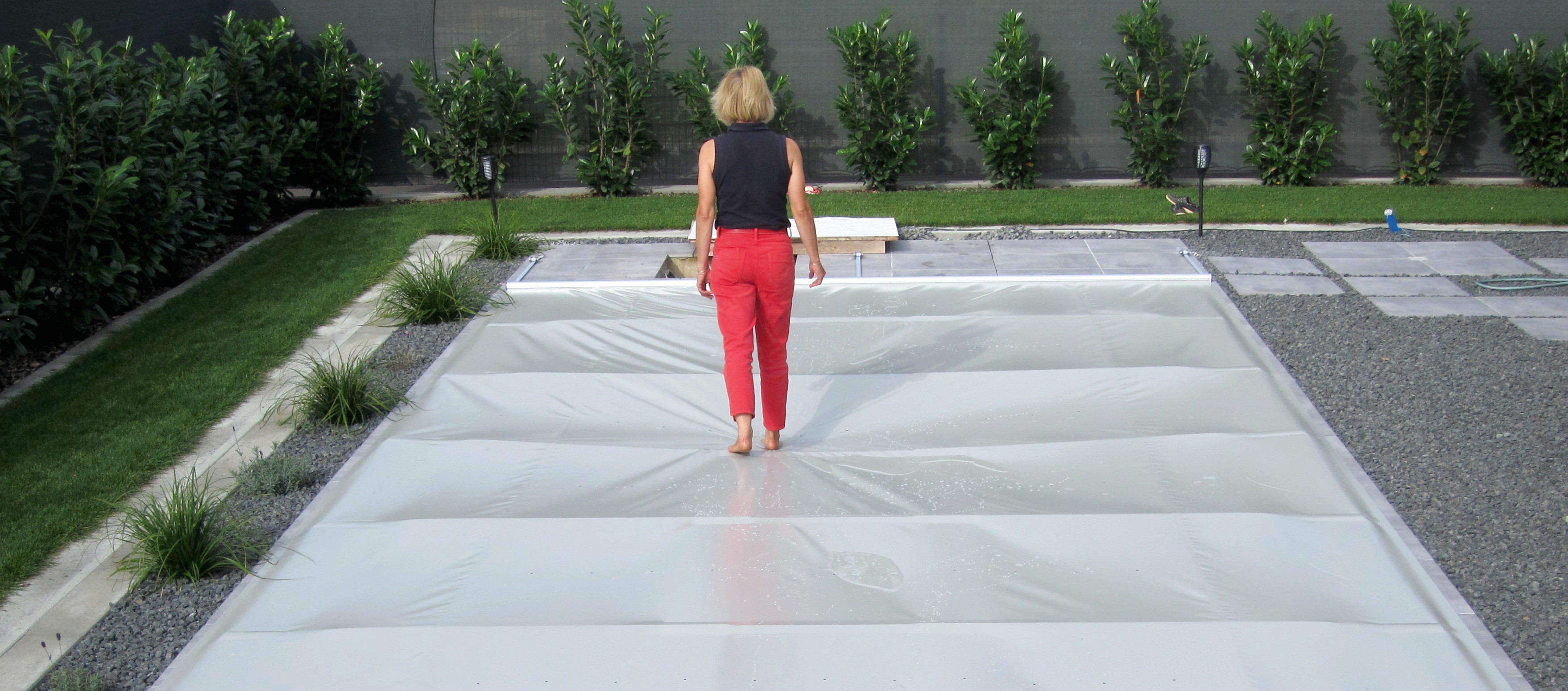 Die Rollabdeckung Flex vereint alle Vorteile herkömmlicher Rollabdeckungen – und noch mehr! Ihr zum Patent angemeldetes Trägersystem kombiniert stärkere Träger mit geringerem Gewicht und hält bis zu 100 kg Belastung stand, ohne sich dauerhaft zu verformen.